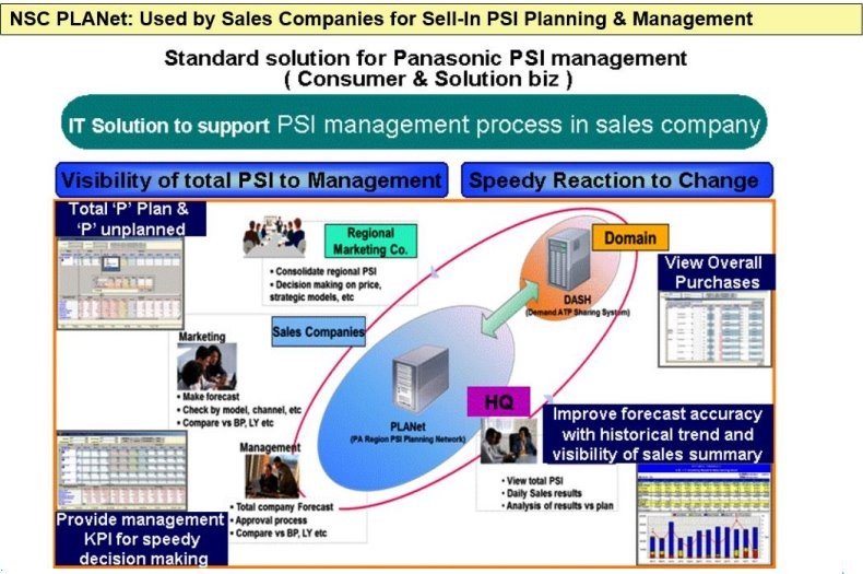 NSC Sell-In is an IT solution to support PSI management process in sales company. This process involves monthly and weekly PSI planning, management of ATP and SCMM purchase orders (including urgent POs), comprehensive business planning, and standardized PSI reporting. The solution is designed to provide consistent and actionable insights for Panasonic PIS companies.